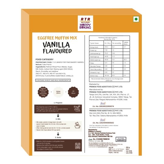 Refined Wheat Flour (Maida), Sugar, Milk Solids(WPC, SMP), Edible Vegetable Oil(Palm), lodised Salt, Baking Powder [INS 500(ii), INS 450(i)), Starch, Emulsifier & Stabilizer [INS 471, INS 475, INS 477 & INS 415], ARTIFICIAL FLAVOURING SUBSTANCE (VANILLA).