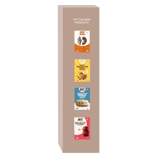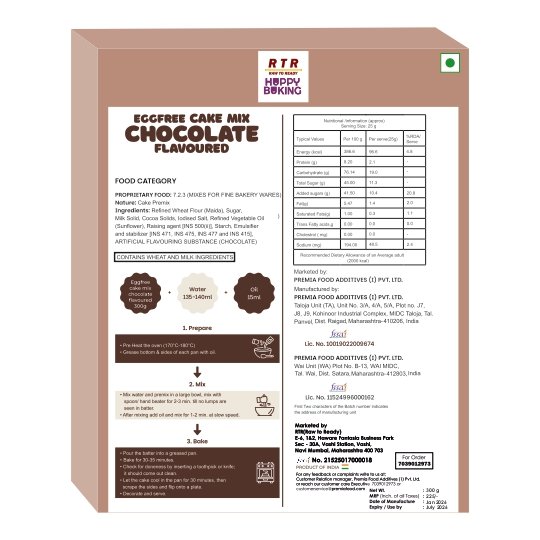 About this item Rich Chocolate Flavour: Premium cocoa blend for moist, decadent chocolate muffins every time. Easy to Bake: Just mix, pour, and bake – no baking expertise required. Eggless Cake Premix: 100% vegetarian formula, ideal for all age groups and occasions. Soft & Moist Texture: Perfect balance of fluffiness and moisture in every bite. Multipurpose Mix: Use for chocolate cupcakes, muffin cakes, or layered bakes. Home Baking Essential: Ideal for festive treats, kids’ tiffin, or quick dessert cravings. No Artificial Preservatives: Made with clean ingredients, no added colors or synthetic additives. Chocolate Muffin Mix 300g: Convenient size to make 6–8 muffins or one medium cake.